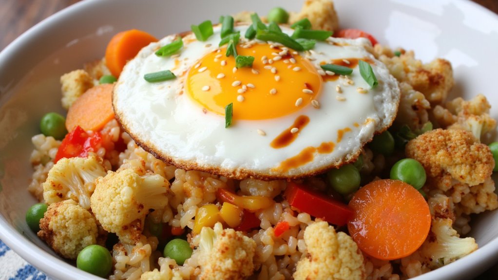 5. Assemble the Bowl: Divide the cauliflower rice mixture among serving bowls. Top each bowl with a fried egg, a drizzle of gochujang, and a sprinkle of sesame seeds and additional green onions for garnish.
