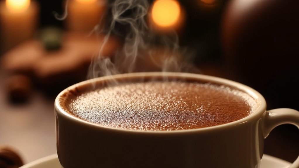 Experimenting with flavors is also encouraged; consider adding a dash of chili powder for a spicy kick or trying different sweeteners like honey or condensed milk. This beverage can be made in larger batches and kept warm in a slow cooker for holiday gatherings, guaranteeing that your guests can enjoy it throughout the celebration!