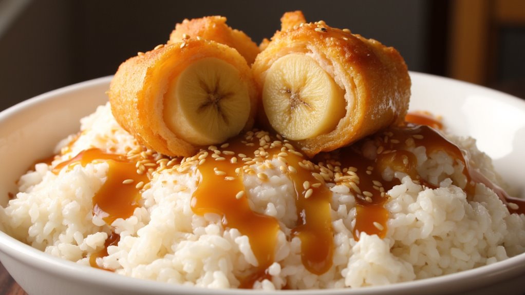 To enhance the flavor of your Turon Dessert Rice Bowl, consider adding a scoop of ube (purple yam) ice cream on top for a creamy and colorful contrast. Additionally, verify that your oil is hot enough before frying to achieve that perfect crispy texture without absorbing too much oil.