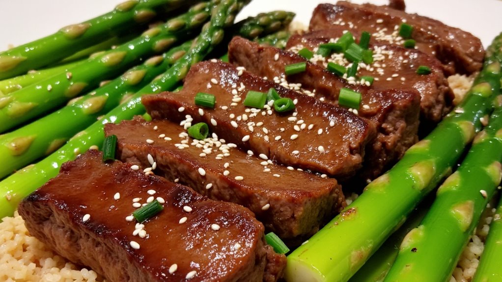 - Combine and Serve: Return the cooked beef to the skillet with the asparagus. Toss everything together and heat for an additional 1-2 minutes, allowing the beef to reheat and the flavors to meld. Remove from heat and garnish with sesame seeds and chopped green onions.