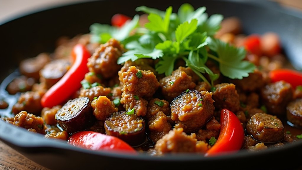 - Serve: Remove from heat and garnish with fresh cilantro or basil leaves. Serve the Vietnamese Ground Beef and Eggplant Skillet over cooked jasmine rice.