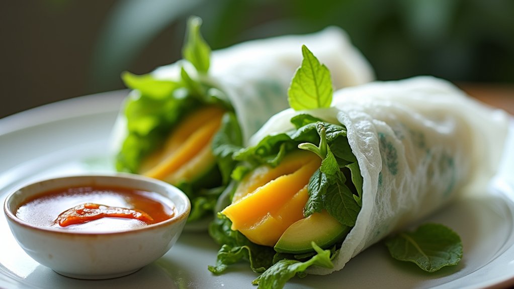 - Assemble the Banh Cuon: Lay a rice sheet flat on a clean surface. Place a few slices of avocado and mango in the center. Add a small handful of mint, cilantro, and basil. Drizzle with lime juice.