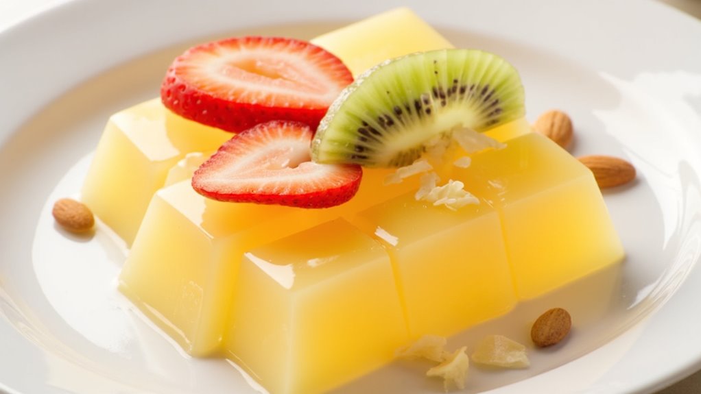 For an even more delightful presentation, serve the jelly in clear dishes to showcase the vibrant colors of the fruit garnishes. Enjoy this invigorating dessert any time!